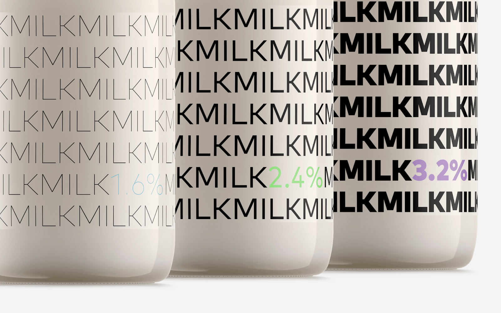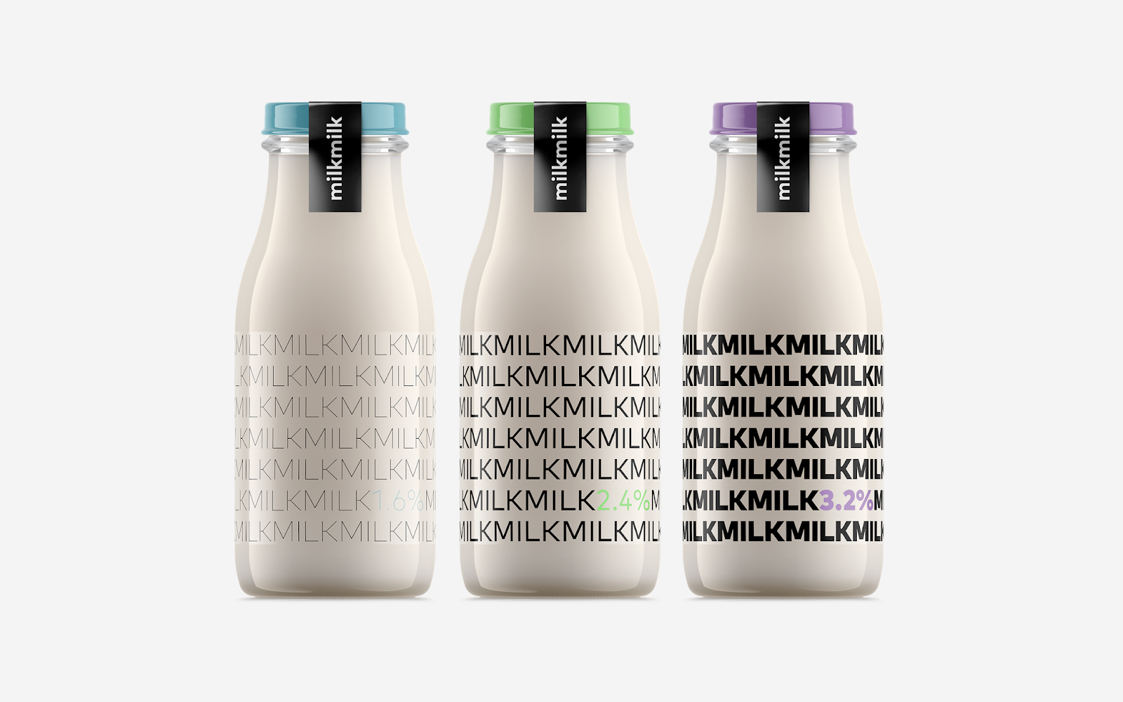 阿塞拜疆設(shè)計(jì)師Rahim Ismayil設(shè)計(jì)的牛奶包裝,設(shè)計(jì)師通過字體粗細(xì)來(lái)表現(xiàn)牛奶的脂肪含量。粗體字表示脂肪含量高,而細(xì)體字則表示脂肪含量低。通過瓶蓋顏色和極簡(jiǎn)外觀讓人有一種新鮮直觀的感覺。讓人在遠(yuǎn)處看到,想走近拿起來(lái),進(jìn)一步了解情況的沖動(dòng)。